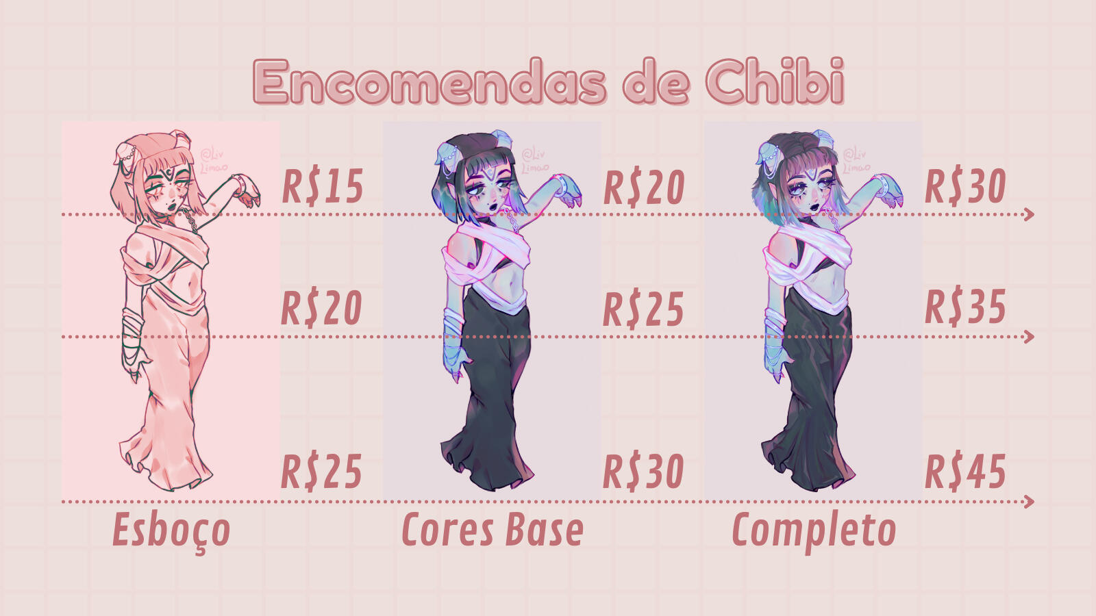 * : Necessário discussão prévia e referência visual.◆Eu NÃO FAÇO: Cenários, Gore pesado, NSFW.◆Reservo meu direito de recusar qualquer pedido que me incomode ou por qualquer motivo pessoal.◆Personagem extra: Preço completo de acordo com a tabela. Por exemplo, se um personagem estiver perto da câmera mostrando apenas meio corpo e outro estiver atrás mostrando o corpo inteiro o preço será: Personagem meio corpo + personagem corpo inteiro◆Personagens complexos ou com elementos e/ou características complexas e/ou Objetos/elementos extras: Aberto para negociação.Qualquer dúvida, entre em contato comigo em qualquer um dos meus links.