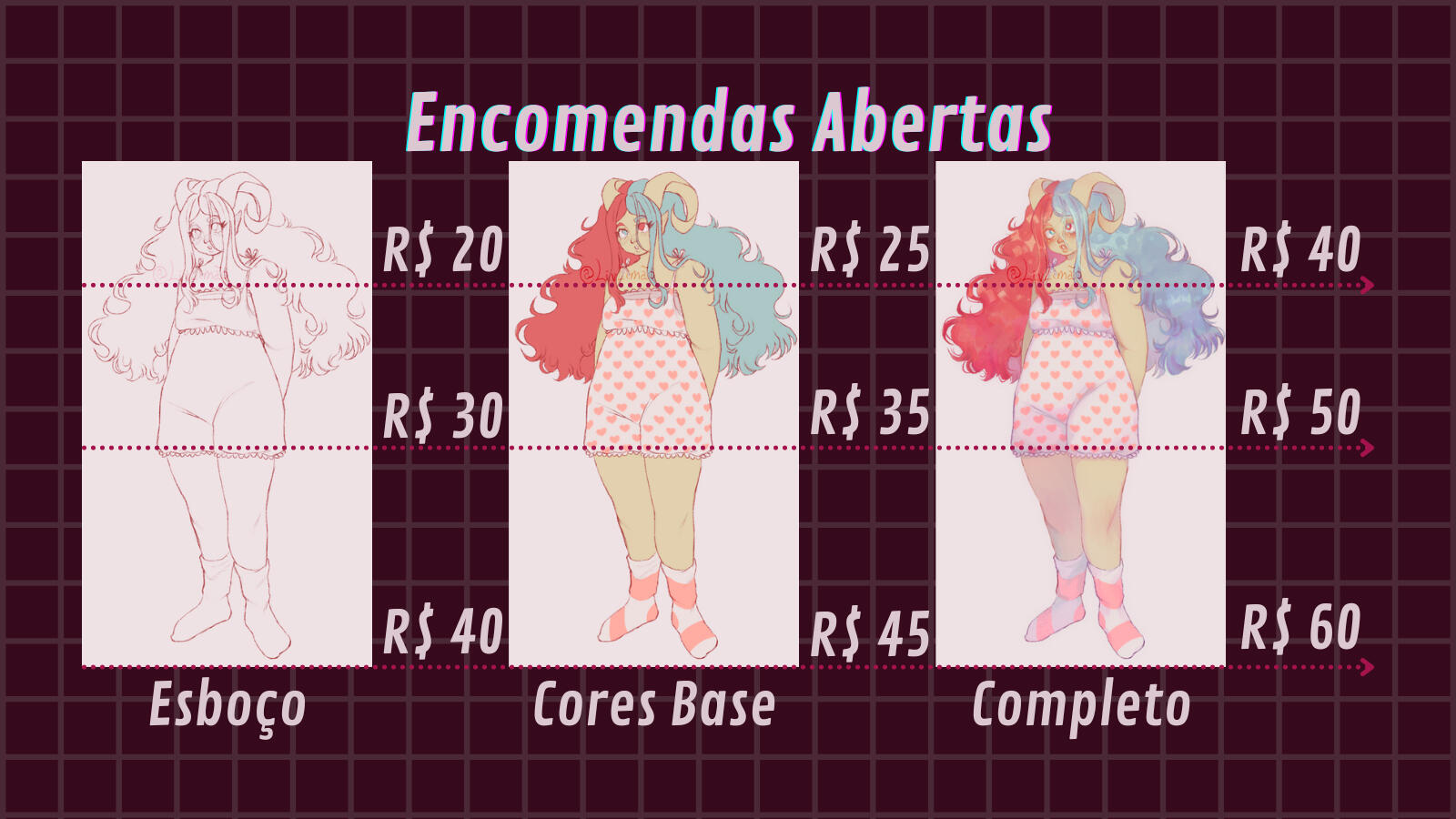 ◆Os preços base em minha tabela são para pedidos de USO PESSOAL APENAS. Para artes de uso comercial, recomendo artistas mais experientes.◆NÃO FAÇO reembolsos após a entrega e consequente pagamento do primeiro esboço em casos de cancelamento do pedido. Se precisar cancelar, por favor não espere até a entrega do esboço.◆O pagamento é 50% após o primeiro esboço é entregue, e 50% antes do produto final ser entregue.◆As atualizações do pedido possuirão marca d'água até o pagamento total for realizado.